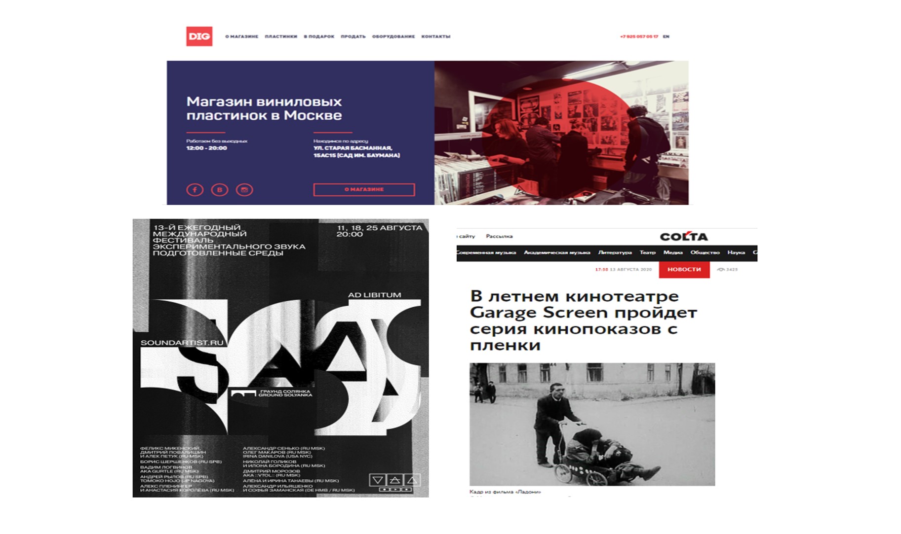 https://www.colta.ru/ ; https://dig-store.ru/ ; https://www.facebook.com/soundartist.ru/photos/a.191794921299471/1176130526199234